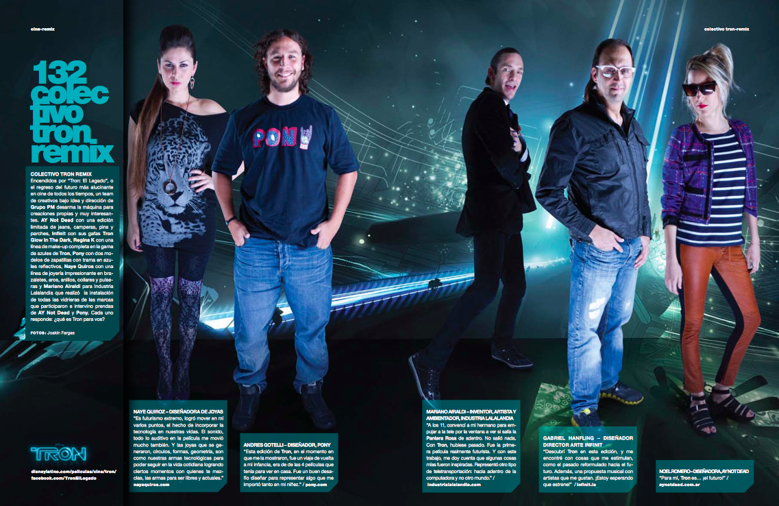 Con motivo del estreno de TRON, EL LEGADO, en argentina se formo el COLECTIVO TRON. Un grupo de diseñadores y marcas inspirados en la emblemática película, dieron forma a ediciones limitadas, piezas únicas de vanguardia y moda, con el sello TRON.