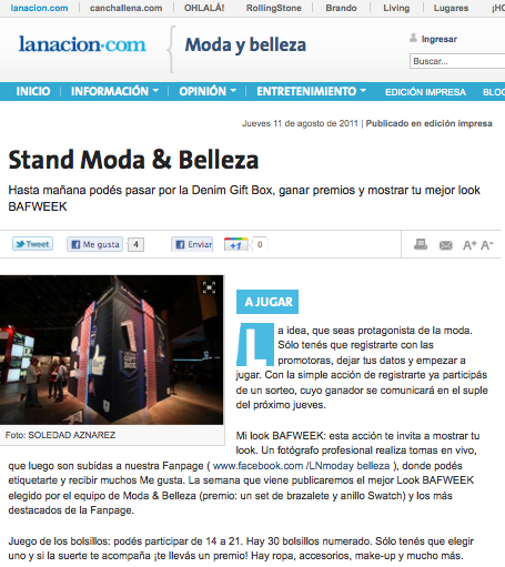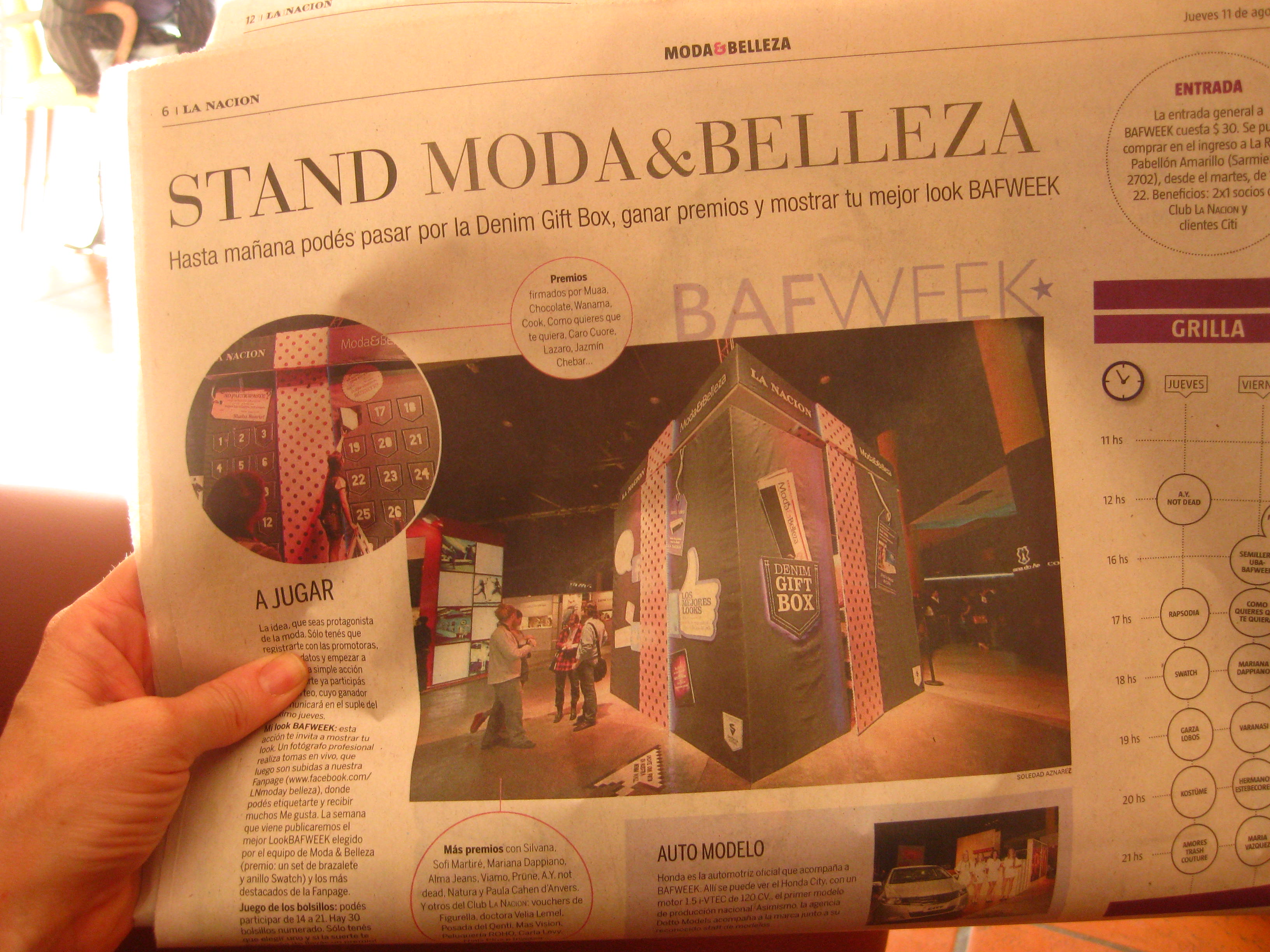 Me convocaron del diario La Nación para generar junto a Equipo IK el contenido del espacio del suplemento Moda y Belleza dentro de la edición del Baf Week Agosto 2011. Asi surgió la DENIM GIFT BOX. Una gran caja de jean con un juego interactivo, en donde los participantes jugaban por diferentes premios: ropa, accesorios, make-up y mucho más.
